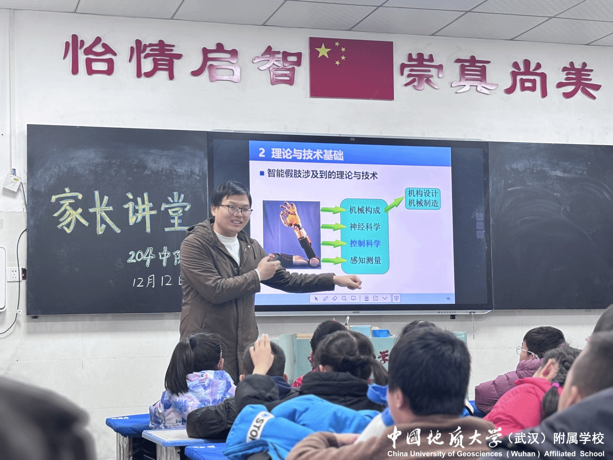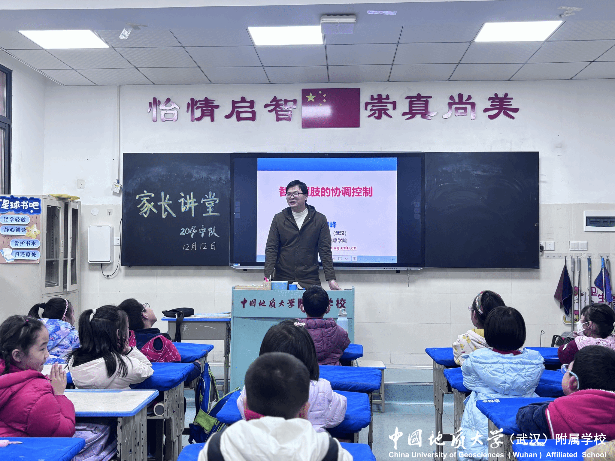 (通讯员:陈倩)为丰富课堂内容,拓宽学生科技视野,12月12日,中国地质大学附属学校204班特邀班级学生家长、中国地质大学机械与电子信息学院葛明峰老师走进课堂,开展以“智能机器人及系统应用”为主题的家长讲堂活动,鲜活有趣的科技知识讲解,收获孩子们的满心喜爱与热烈好评。