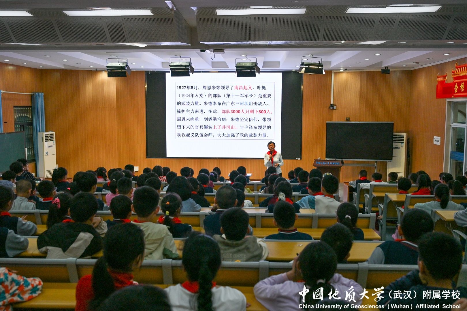 朱勤文教授是中国地质大学(武汉)教授、原校党委副书记,拥有丰富的党建工作经验和深厚的思政教育积淀。讲座中,朱教授以生动鲜活的语言、感人至深的革命事例,带领少先队员们重温了长征路上波澜壮阔的历史画卷,深入阐释了长征精神“坚定信念、不畏艰险、百折不挠、团结奋进”的核心内涵,引导队员们深刻感悟革命先辈为民族独立、人民解放不畏牺牲、奋勇拼搏的崇高品格,教育引导队员们从小听党话、感党恩、跟党走,将长征精神内化于心、外化于行,融入日常学习和生活的每一个细节。