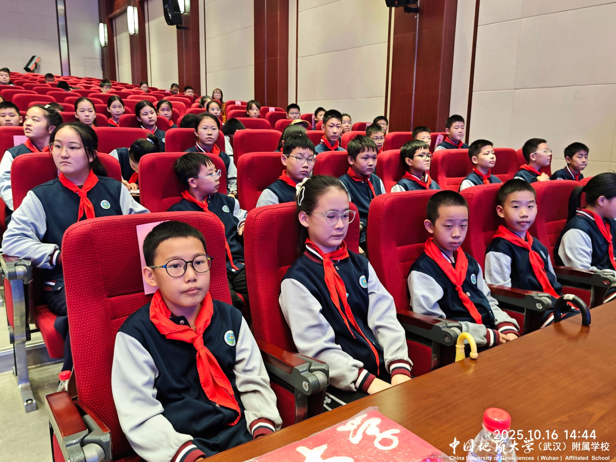 (通讯员:程吟)2025年10月16日下午,我校六(1)班全体队员在大队辅导员段亚清老师和中队辅导员程吟老师的带领下,作为洪山区学生代表参加“科学精神与人文情怀融合赋能大讲堂·走进华中科技大学”活动,其中安宸璐同学作为学生代表发言,展现地大附校学子风采。
