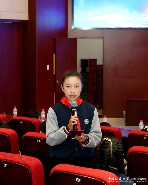 在学生代表交流环节,安宸璐同学结合所见所感,分享对科学精神与人文情怀的理解:“黄旭华爷爷的故事如同一束温暖而明亮的光,这束光里有探索真理的科学家精神,也有热爱家国的人文情怀。”她坚定表示,将以黄旭华院士为榜样,努力成长为兼具探索精神与担当情怀的新时代少年。其真挚发言不仅引发全场共鸣,更让外界看到地大附校在科学教育与人文培养上的扎实成果。