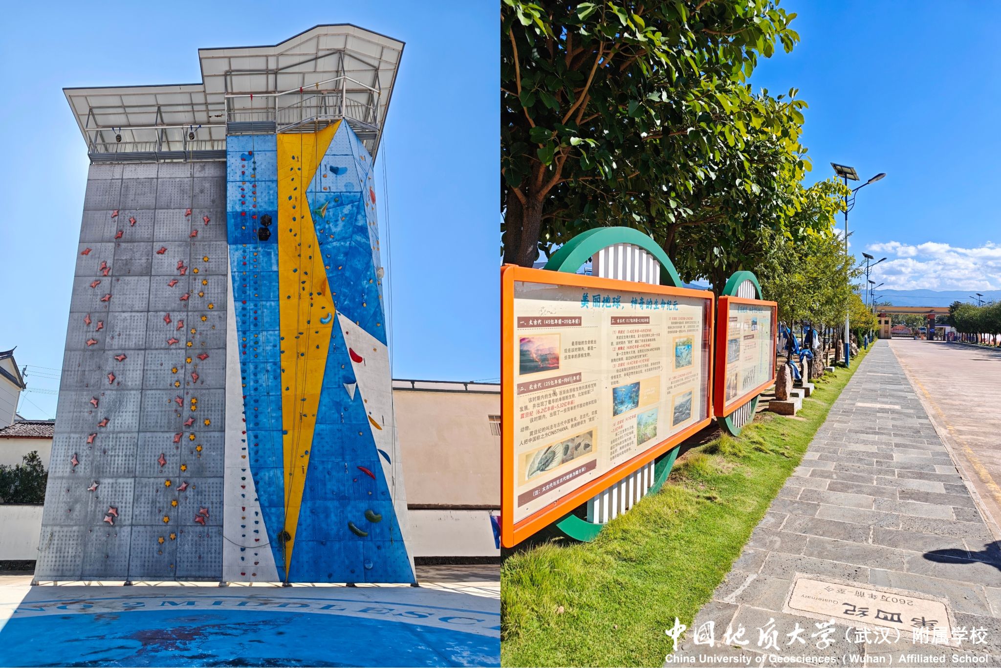 施甸二中为地大附校一行举行了简短的欢迎仪式。施甸二中领导对老师们的到来表示诚挚欢迎,并简要介绍了学校的发展历程与办学现状。紧接着,薛元华代表地大附校致辞并向施甸二中捐赠了一批体育器材,传递深情厚谊。随后,老师们实地参观校园。攀岩墙、地质科普长廊、录播教室等特色设施,不仅展现了学校的硬件实力,更无声诉说着中国地质大学(武汉)对口帮扶施甸二中的深厚情谊与扎实成果。